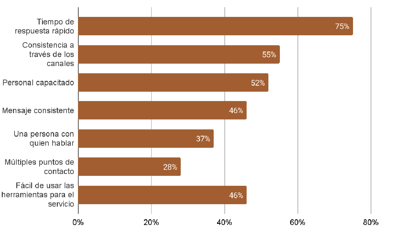 A partir de una encuesta realizada a 1.920 profesionales de EEUU se les preguntó cuál es el factor más importante en la experiencia a los clientes, resultando el más prioritario un bajo tiempo de respuesta a los clientes (75%)