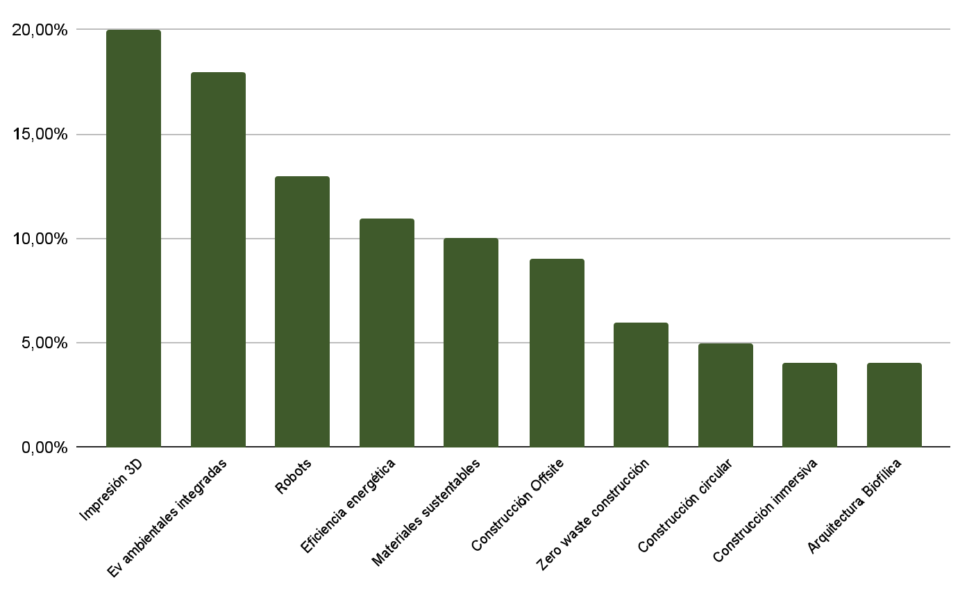 Las empresas están desarrollando soluciones para reducir el impacto ambiental y mejorar el rendimiento de los edificios. La tendencia más prevalente es la impresión 3D, ofrece flexibilidad en el diseño y reduce el tiempo de producción