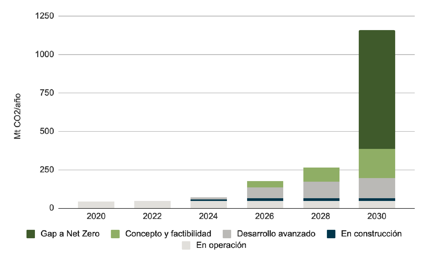 Al 2022 existía una capacidad de captura de CO2 de 45 Mton al año. Se proyecta una capacidad instalada de aproximadamente 200 Mton al 2030, faltando aún un gap de 776 Mton para llegar a la carbono neutralidad