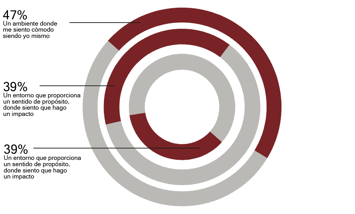 Un 47% de las personas lo que más valoran al elegir una empresa es una atmósfera en la que puedan sentirse ellos mismos. Por otro lado, un ambiente que tenga un propósito y donde los trabajadores hacen un impacto, es el aspecto más valorado por un 39%. Finalmente, la flexibilidad es el un aspecto priorizado por un 36% de los trabajadores